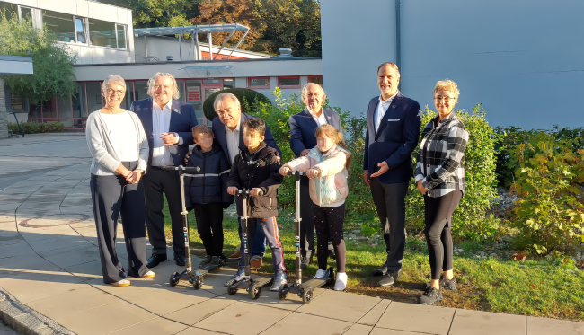 Mit viel Herz für Bewegung und Förderung: Die Stadtrichter zu Clagenfurth brachten den Kindern der Volksschule 14 neue Kickboards vorbei.